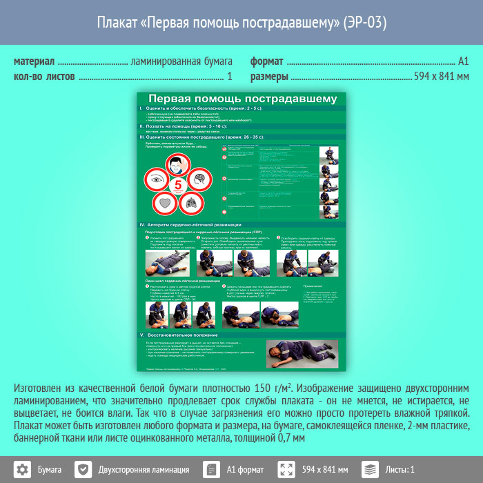Плакат «Первая помощь пострадавшему» (ЭР-03, ламинированная бумага, А1, 1 лист) в Москве купить