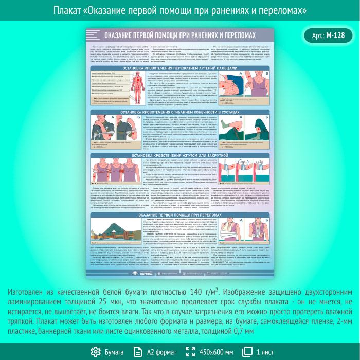 Плакат «Оказание первой помощи при ранениях и переломах» (М-128, ламинированная бумага, А2, 1 лист) в Москве купить