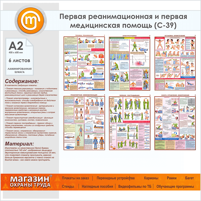 Плакат «Оказание первой помощи пострадавшим» (С-39, ламинированная бумага, А2, 6 листов) в Москве купить