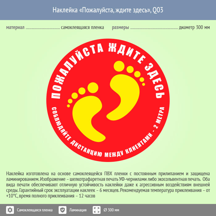 Наклейка на пол «Пожалуйста, ждите здесь», Q03 используется на время карантина для напоминания о необходимости соблюдения дистанции. Согласно постановлению главы Роспотребнадзора Анны Поповой от 1 апреля, все жители России должны соблюдать дистанцию и не подходить друг к другу ближе чем на один метр. В сообщении говорится, что ограничения не распространяются на поездки в легковых такси