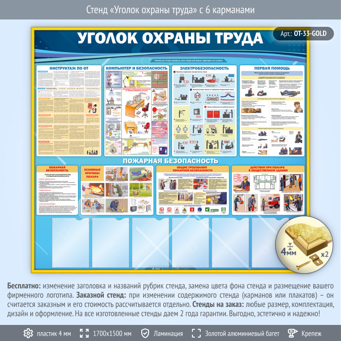 Стенд «Уголок охраны труда» с 6 карманами (OT-33-GOLD) в Москве купить