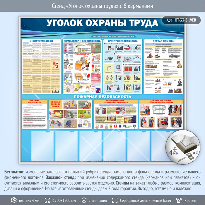 Стенд «Уголок охраны труда» с 6 карманами (OT-33-SILVER) в Москве купить