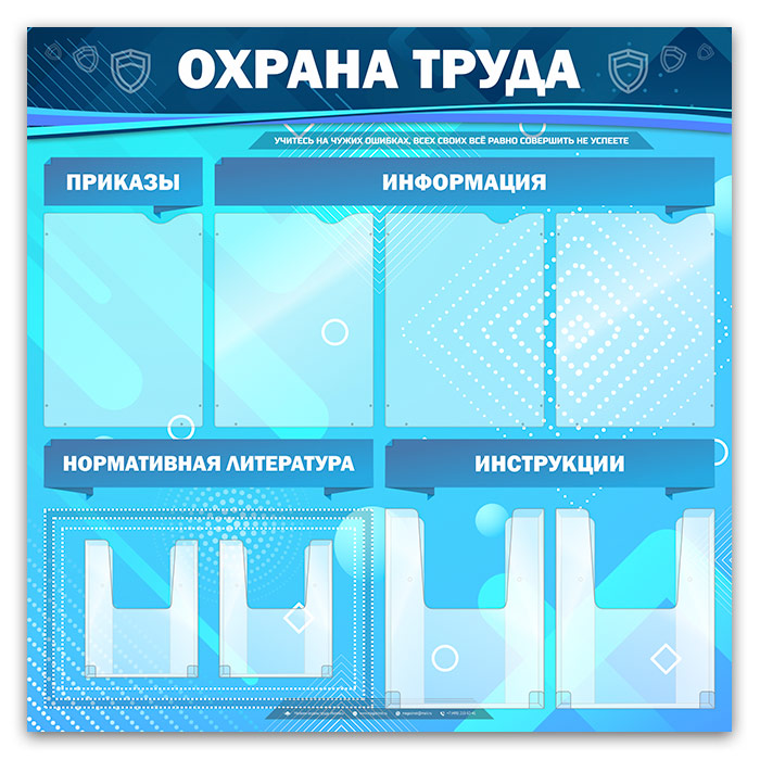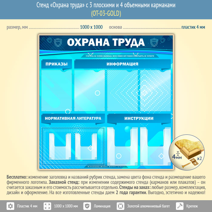 Стенд «Охрана труда» с 4 плоскими и 4 объемными карманами (OT-03-GOLD) в Москве купить
