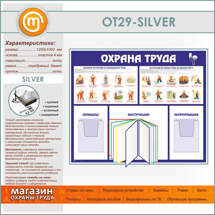 Стенд «Охрана труда» с перекидной системой и 2 объемными карманами (OT-29-SILVER) в Москве купить