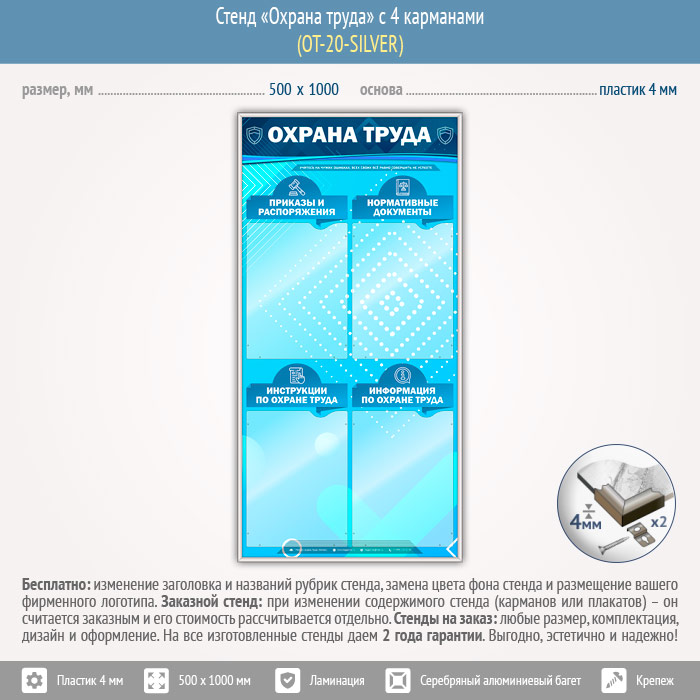 Стенд «Охрана труда» с 4 карманами (OT-20-SILVER) в Москве купить