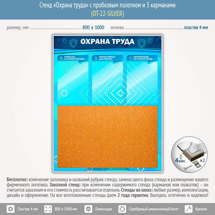 Стенд «Охрана труда» с пробковым полотном и 3 карманами (OT-22-SILVER) в Москве купить