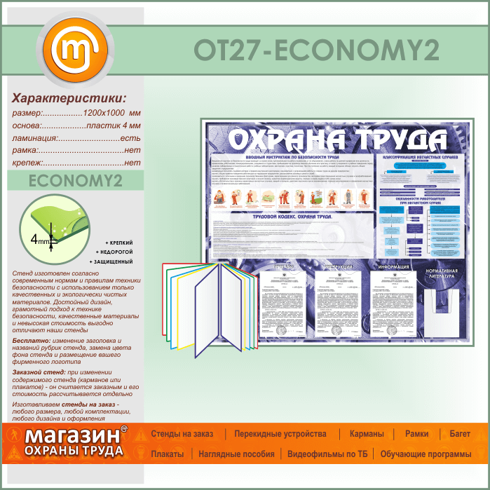 Стенд «Охрана труда» с перекидной системой, 3 плоскими и 1 объемным карманом (OT-27-ECONOMY2) в Москве купить