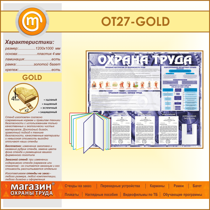 Стенд «Охрана труда» с перекидной системой, 3 плоскими и 1 объемным карманом (OT-27-GOLD) в Москве купить