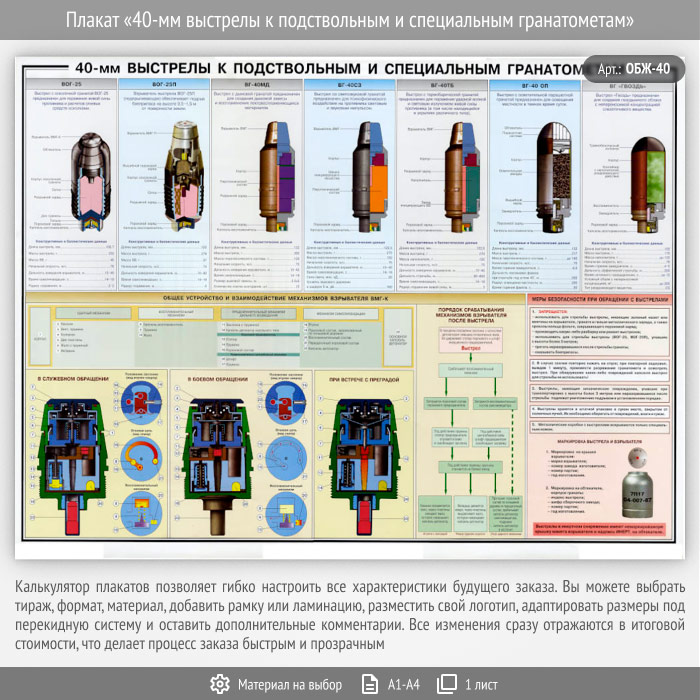 Плакат «40-мм выстрелы к подствольным и специальным гранатометам» (ОБЖ-40, 1 лист) в Москве купить