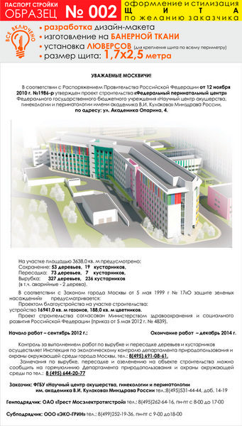 Паспорт стройки, образец № 2 (баннерная ткань, 1700х2500 см) в Москве купить