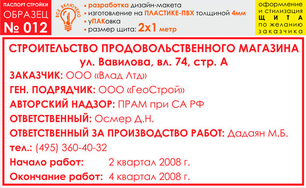 Паспорт стройки, образец № 12 (пластик 4 мм, 2000х1000 cм) в Москве купить