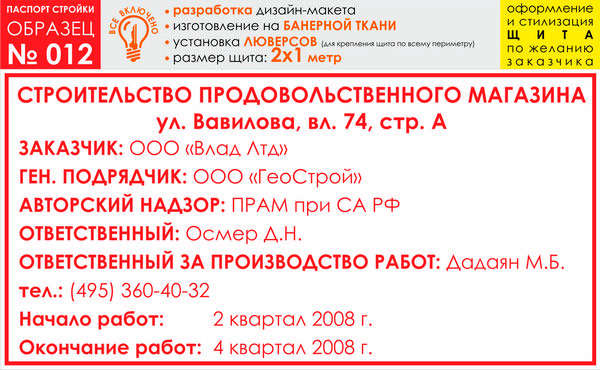 Паспорт стройки, образец № 12 (баннерная ткань, 2000х1000 cм) в Москве купить