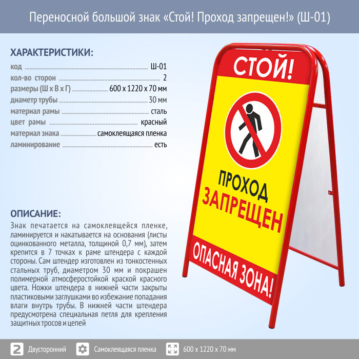 Переносной большой знак «Стой! Проход запрещен!» (Ш-01, двусторонний, самоклеящаяся пленка) в Москве купить