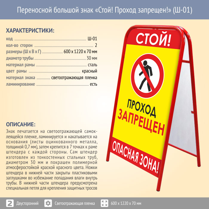 Переносной большой знак «Стой! Проход запрещен!» (Ш-01, двусторонний, светоотражающая пленка) в Москве купить