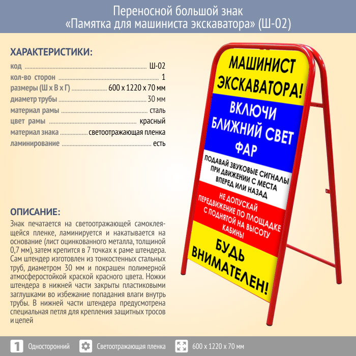 Переносной большой знак «Памятка для машиниста экскаватора» (Ш-02, односторонний, светоотражающая пленка) в Москве купить