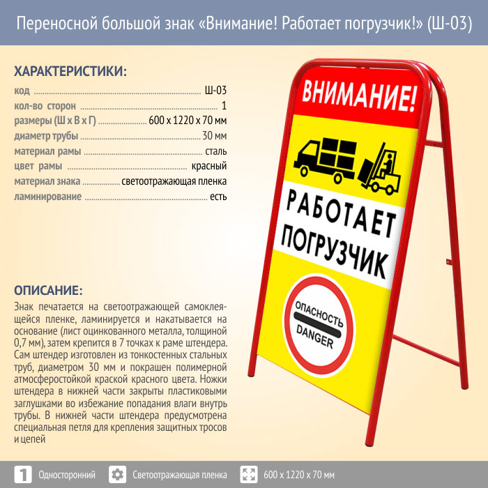 Переносной большой знак «Внимание! Работает погрузчик!» (Ш-03, односторонний, светоотражающая пленка) в Москве купить