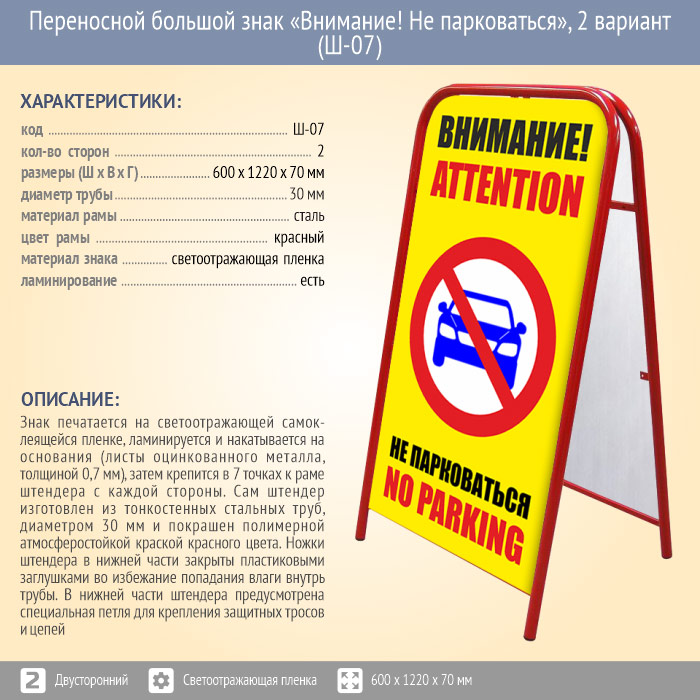 Переносной большой знак «Внимание! Не парковаться», 2 вариант (Ш-07, двусторонний, светоотражающая пленка) в Москве купить