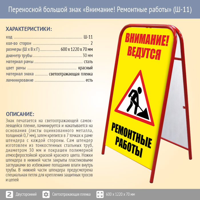 Переносной большой знак «Внимание! Ремонтные работы» (Ш-11, двусторонний, светоотражающая пленка) в Москве купить