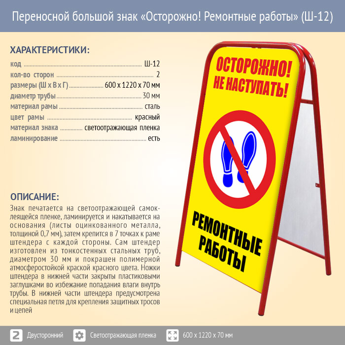 Переносной большой знак «Осторожно! Ремонтные работы» (Ш-12, двусторонний, светоотражающая пленка) в Москве купить