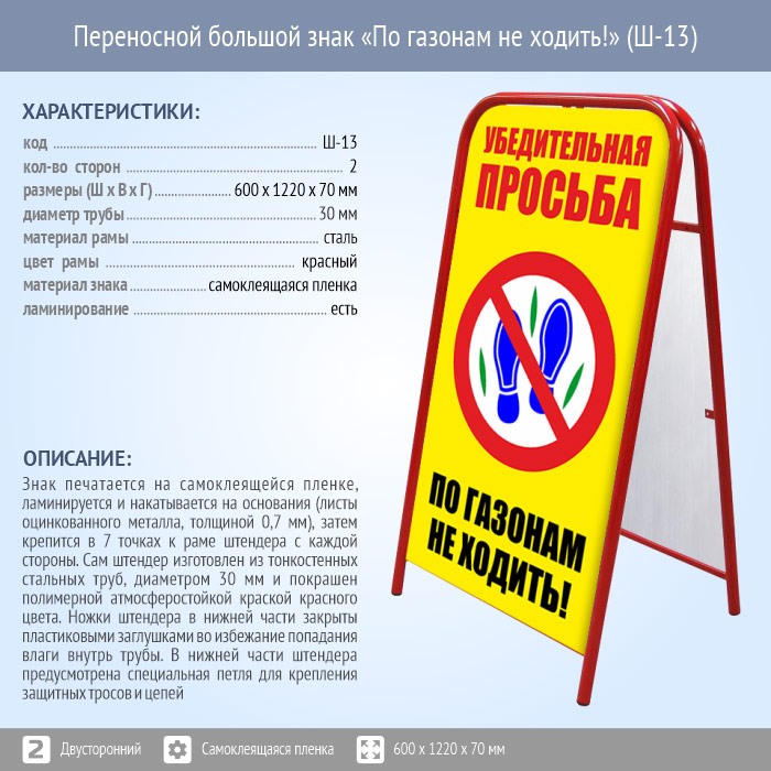 Переносной большой знак «По газонам не ходить!» (Ш-13, двусторонний, самоклеящаяся пленка) в Москве купить