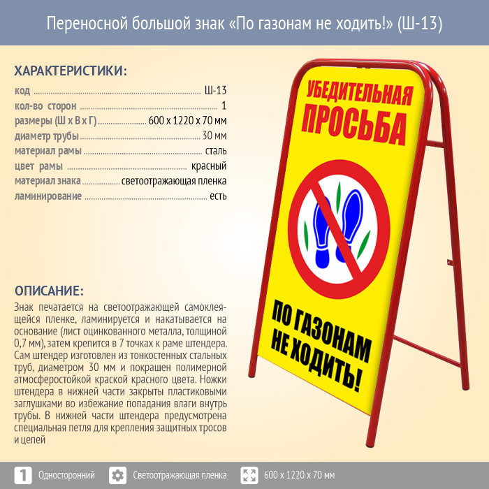 Переносной большой знак «По газонам не ходить!» (Ш-13, односторонний, светоотражающая пленка) в Москве купить