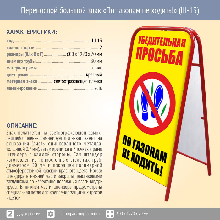 Переносной большой знак «По газонам не ходить!» (Ш-13, двусторонний, светоотражающая пленка) в Москве купить