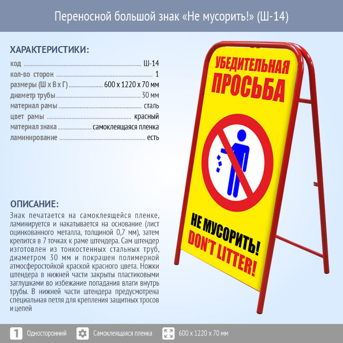 Переносной большой знак «Не мусорить!» (Ш-14, односторонний, самоклеящаяся пленка) в Москве купить