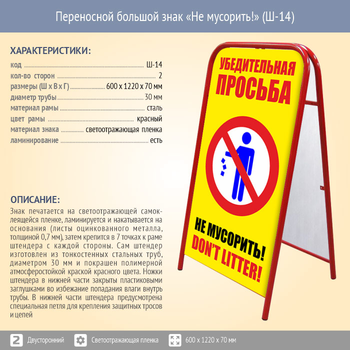 Переносной большой знак «Не мусорить!» (Ш-14, двусторонний, светоотражающая пленка) в Москве купить