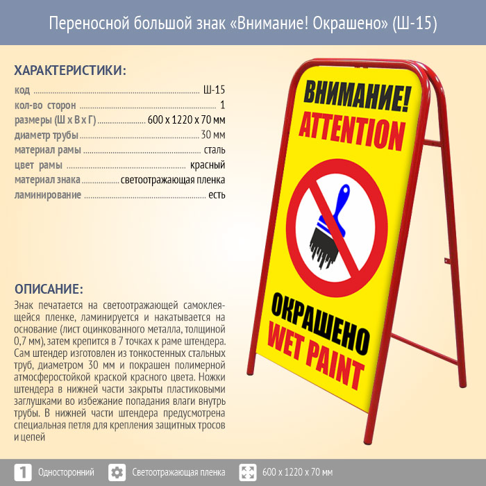 Переносной большой знак «Внимание! Окрашено» (Ш-15, односторонний, светоотражающая пленка) в Москве купить