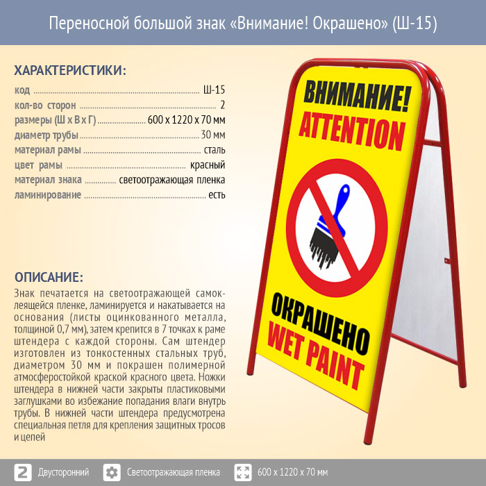 Переносной большой знак «Внимание! Окрашено» (Ш-15, двусторонний, светоотражающая пленка) в Москве купить
