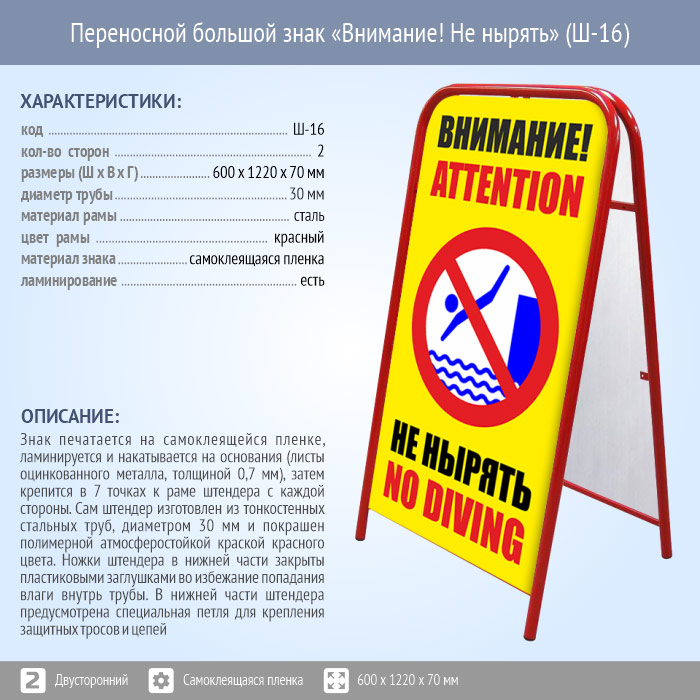 Переносной большой знак «Внимание! Не нырять» (Ш-16, двусторонний, самоклеящаяся пленка) в Москве купить