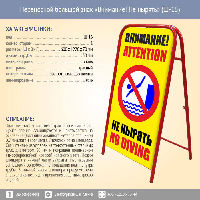Переносной большой знак «Внимание! Не нырять» (Ш-16, односторонний, светоотражающая пленка) в Москве купить