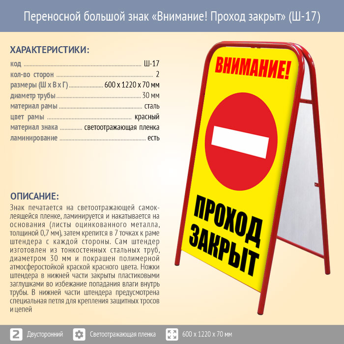 Переносной большой знак «Внимание! Проход закрыт» (Ш-17, двусторонний, светоотражающая пленка) в Москве купить