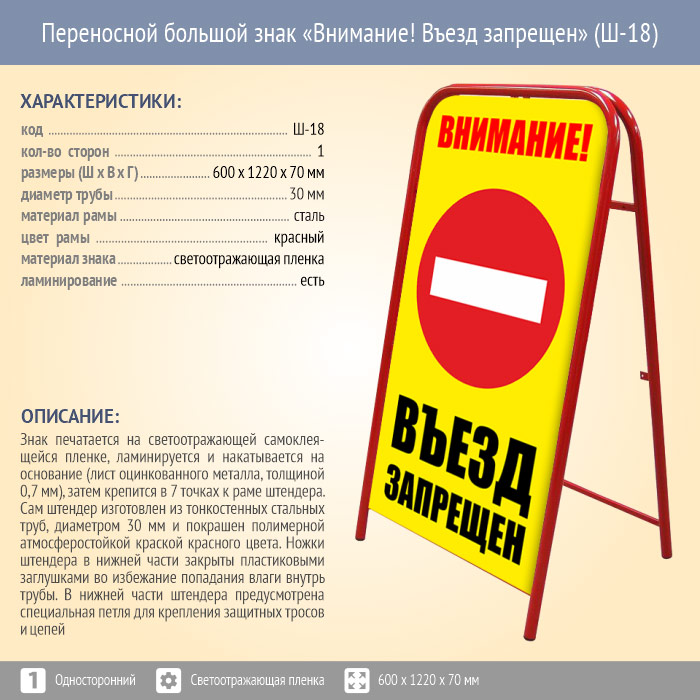 Переносной большой знак «Внимание! Въезд запрещен» (Ш-18, односторонний, светоотражающая пленка) в Москве купить
