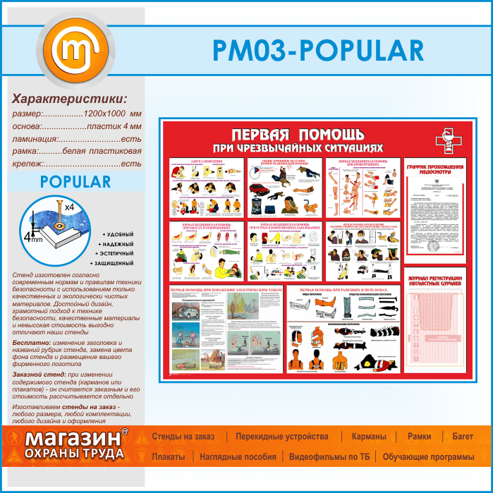 Стенд «Первая помощь при чрезвычайных ситуациях» с плоским и объемным карманами (PM-03-POPULAR) в Москве купить