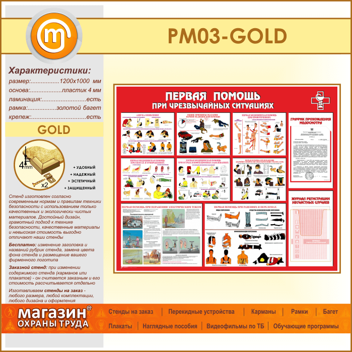 Стенд «Первая помощь при чрезвычайных ситуациях» с плоским и объемным карманами (PM-03-GOLD) в Москве купить