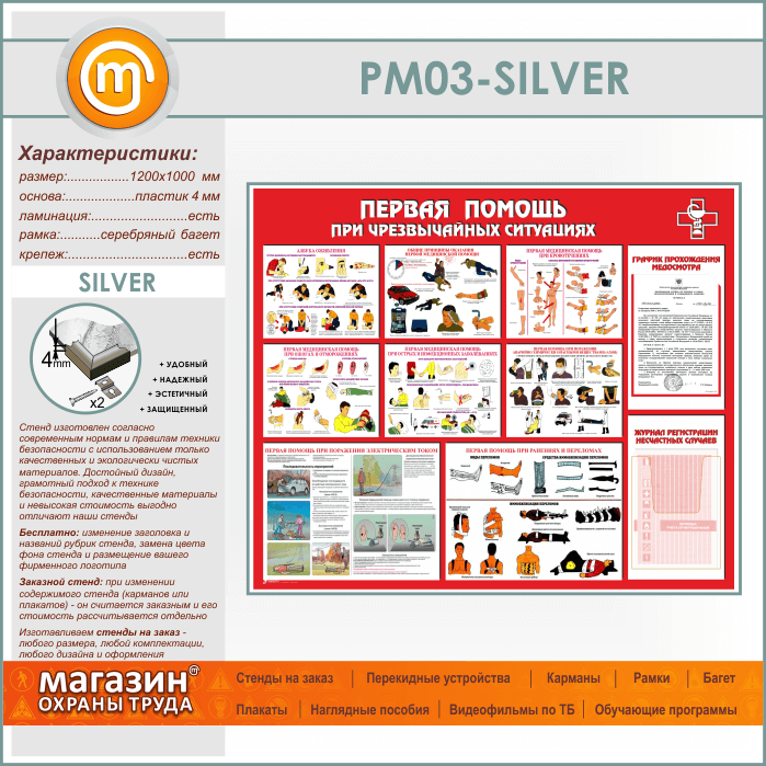 Стенд «Первая помощь при чрезвычайных ситуациях» с плоским и объемным карманами (PM-03-SILVER) в Москве купить