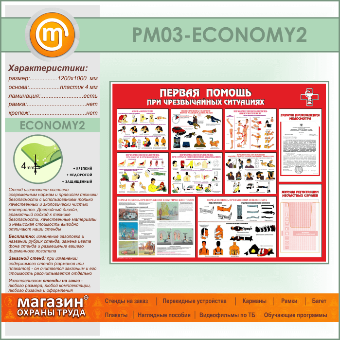 Стенд «Первая помощь при чрезвычайных ситуациях» с плоским и объемным карманами (PM-03-ECONOMY2) в Москве купить