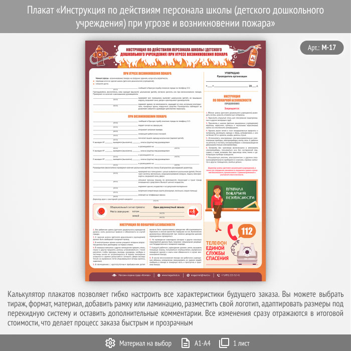 Плакат «Инструкция по действиям персонала школы (детского дошкольного учреждения) при угрозе и возникновении пожара» (М-17, 1 лист)