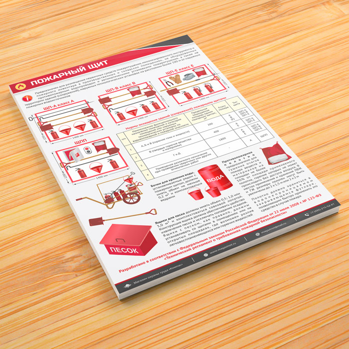 В плакате «Пожарный щит» наглядно изображена необходимая комплектация щитов ЩП-А, ЩП-В, ЩП-Е и ЩПП, описаны нормы оснащения зданий (сооружений) пожарными щитами, рассказано о требованиях к бочкам для хранения воды, ящикам с песком и пожарному полотну. Плакат разработан в соответствии с ФЗ РФ от 22.07.2008 № 123-ФЗ «Технический регламент о требованиях пожарной безопасности»