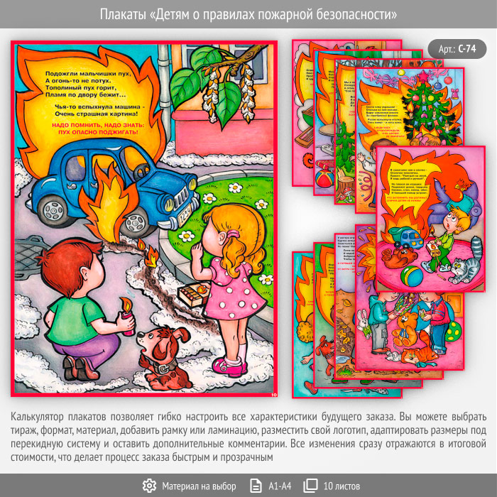 Комплект плакатов «Детям о правилах пожарной безопасности» из 10 листов – достойное качество и полезная информация по приемлемой цене. Разрабатываем макеты, создаем иллюстрации и изготавливаем плакаты на любую интересующую Вас тематику любых форматов на бумаге, самоклеящейся пленке, пластике, баннерной ткани и металле