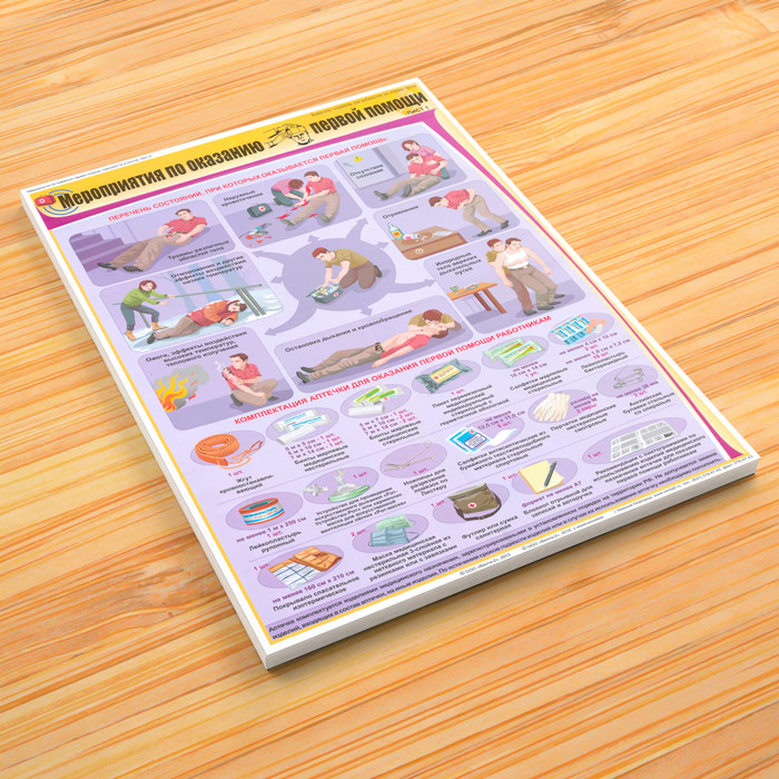 В комплекте плакатов из 2 листов «Мероприятия по оказанию первой помощи» описывается перечень состояний, при которых оказывается первая помощь, комплектация аптечки для оказания первой помощи, мероприятия по оказанию первой помощи