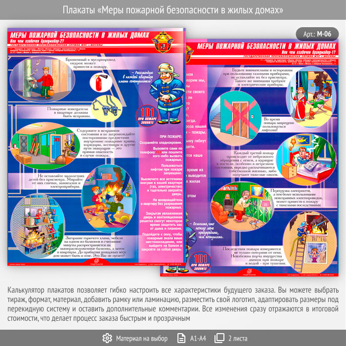 Комплект плакатов «Меры пожарной безопасности в жилых домах» из 2 листов может быть изготовлен любого формата и размера, на бумаге, самоклеящейся пленке, пластике, баннерной ткани и металле. Разрабатываем, рисуем и изготавливаем плакаты на любую интересующую Вас тематику