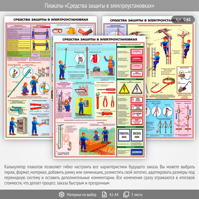 Плакаты «Средства защиты в электроустановках» (С-65, 3 листа)Плакаты «Средства защиты в электроустановках» (С-65, 3 листа)Плакаты «Средства защиты в электроустановках» (С-65, 3 листа)