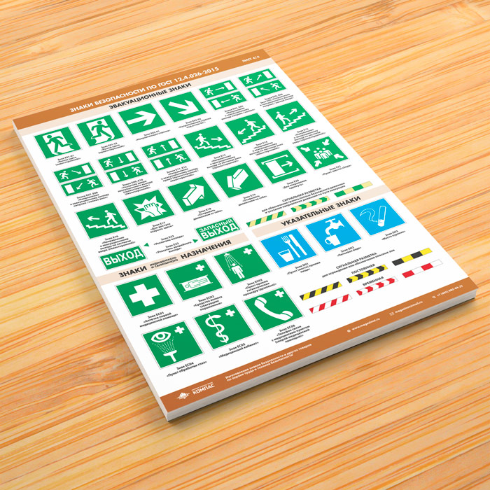 • Плакат с эвакуационными знаками, знаками медицинского и санитарного назначения, указательными знаками и сигнальной разметкой