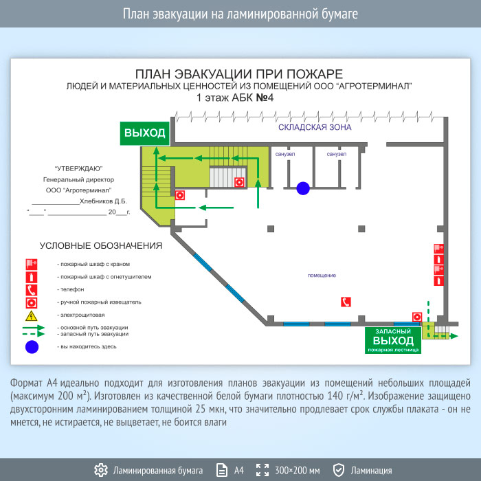 Предлагаем изготовление планов эвакуации А4-А0 форматов. В стоимость изготовления планов эвакуации на ламинированной бумаге входит: разработка и согласование макета, печать, ламинация. Если у вас есть рамка где разместить план эвакуации, то бумага экономный и разумный выбор