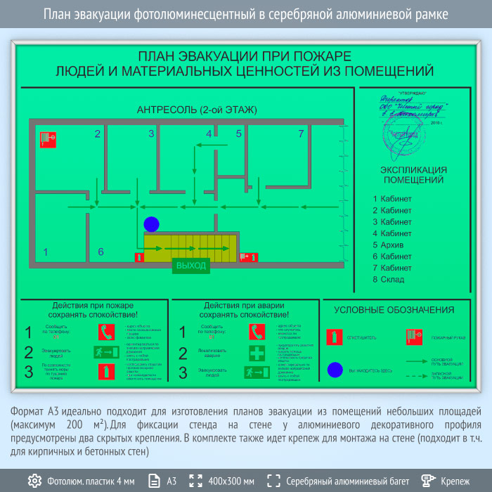 План эвакуации фотолюминесцентный в серебряной алюминиевой рамке (А3 формат) в Москве купить