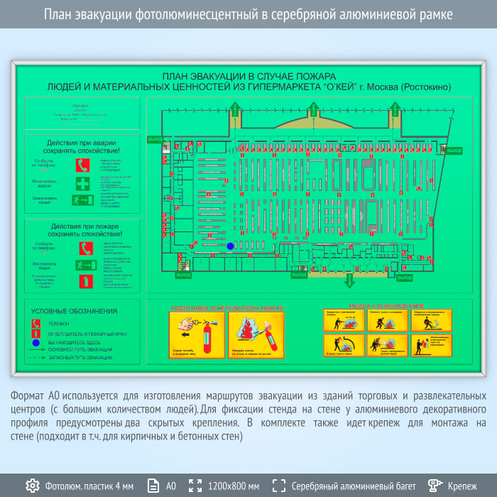 План эвакуации фотолюминесцентный в серебряной алюминиевой рамке (А0 формат) в Москве купить