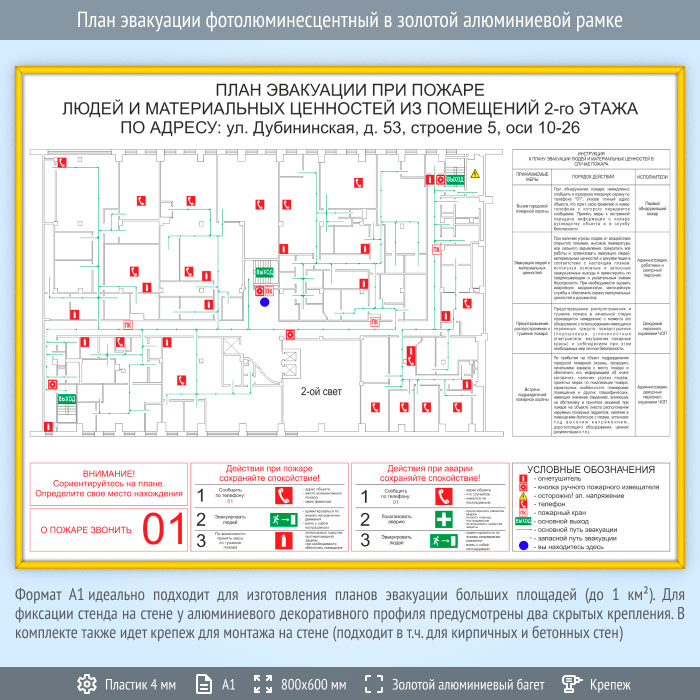План эвакуации в золотой алюминиевой рамке (А1 формат) в Москве купить
