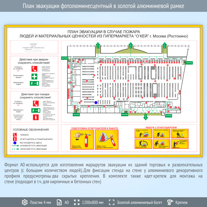 План эвакуации в золотой алюминиевой рамке (А0 формат) в Москве купить